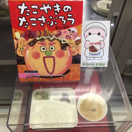写真中央は、本日の献立サンプルと、給食図書です。本日の給食図書は、「たこやきのたこさぶろう」でした。たこやきのたこさぶろうが、ある理由でたこやき屋さんを出て行こうとする絵本でした。