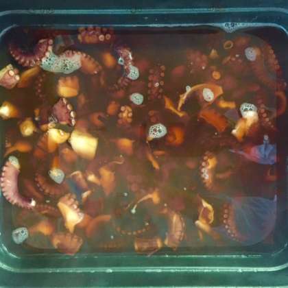 写真右は、煮あがったばかりのたこのやわらか煮です。