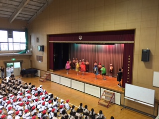 9月8日(木)朝の児童集会は、代表委員が来週から始まる「あいさつ週間」のキャンペーンの劇をしました。劇では架空の「笑顔いっぱいの小学校」から転校してきた小学生が、あいさつをしない子どもたちに「あいさつは大切だよ」と伝えます。「あいさつなんて必要ない」という悪者を、5レンジャーに励まされた全校児童が大きなあいさつでやっつけて劇は終わりました。来週からの「あいさつ週間」が楽しみです。