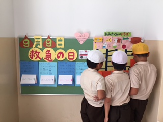 9月9日(金)今日は日付によって「救急の日」と名付けられた日です。保健室横には、養護教諭が毎月楽しくわかりやすい掲示を作っているので、子どもたちがよく見に来ています。
