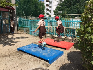運動場のウサギ小屋の横に、管理作業員さん自作の「ジャンプボード」が置かれています。子どもたちに大人気で、数年前に作ったものは毎日たくさんの子どもたちが入れ代わり立ち代わりで上に乗って跳ぶので、だんだん弾力がなくなってきていました。そこで夏休み前から管理作業員さんが新しいジャンプボードを作って、2学期にデビューしました。ブルーとオレンジの鮮やかなボードに子どもたちは大喜び。さっそくなわとびで跳んでいます。