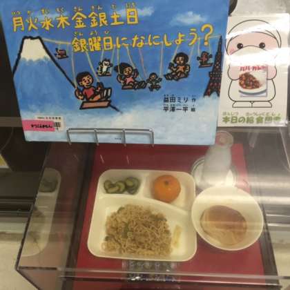 写真中央は、本日の献立サンプルと、給食図書です。本日の給食図書は、「月火水木金銀土日 銀曜日になにしよう?」でした。空でぶらんこをして遊んだり、プールいっぱいの焼きそばを食べたりする、夢のある絵本でした。