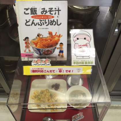 写真中央は、本日の献立サンプルと、給食図書です。本日の給食図書は、「ご飯 みそ汁 どんぶりめし」でした。ごはんの炊き方やいろいろなどんぶりが載ってる図書でした。