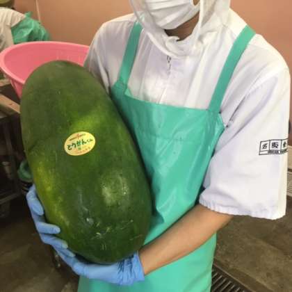 写真右は、本日使用した「とうがん」の写真です。本日は1つ約5kgのものが使われました。