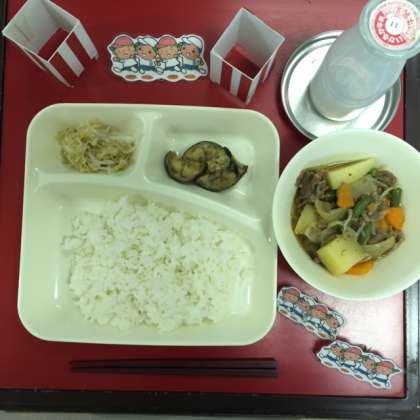 本日の献立は「肉じゃが・焼きなすのみそだれかけ・もやしのゆずの香あえ・ごはん・牛乳」でした。