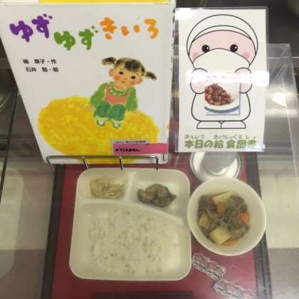 写真中央は、本日の献立サンプルと、給食図書です。本日の給食図書は、「ゆず ゆず きいろ」でした。冬至の日に家族で、ゆずを浮かべたお風呂に入る物語でした。