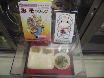 写真中央は、本日の献立サンプルと、給食図書です。本日の給食図書は「みそのひみつ」でした。まんがでみその作り方が、わかりやすく説明された図書でした。