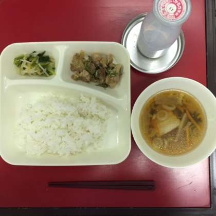 本日の献立は「鶏肉のごまだれ焼き・ソーキ汁・チンゲンサイともやしの甘酢あえ・ごはん・牛乳」でした。