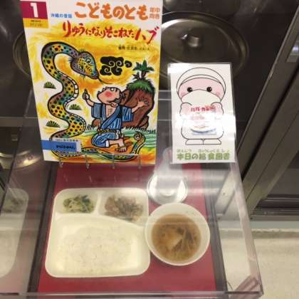 写真中央は、本日の献立サンプルと、給食図書です。本日の給食図書は「りゅうになりそこねたハブ」でした。沖縄の昔話で、カナーと言う村人と、蛇のハブの物語でした。2人は2人だけの約束をするのですが…その後が気になった方は、実際に読んでみてくださいね。