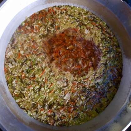 ソーキ汁は沖縄料理で、下ゆでした豚バラ肉、だいこん、切りこんぶ等が入った、汁物献立でした。ソーキとは沖縄で豚のあばら肉のことです。