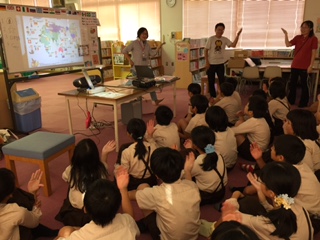 1,2時間目は図書館で、6年生を対象にTSTがありました。初めに「ドイツじゃなくてGermany」というチャンツをした後、形について英語で学習したり、エリック・カールの"The secret birthday message"の絵本を読み聞かせしたりしてくださいました。ふだんから外国語活動をしている6年生はさすがによく英語を理解できていました。
