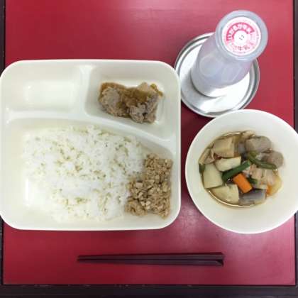 本日の献立は「豚肉のねぎだれかけ・鶏肉とれんこんの煮もの・ツナ大豆そぼろ・ごはん・牛乳」でした。