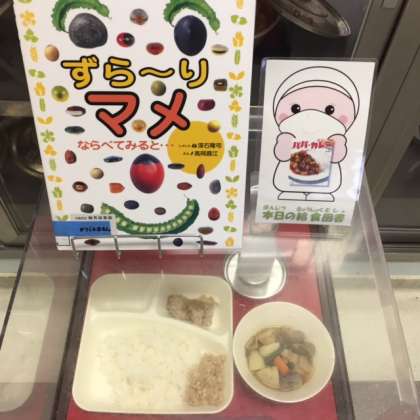 写真中央は、本日の献立サンプルと、給食図書です。本日の給食図書は「ずら〜り マメ」でした。エンドウ、ソラマメ等の食べ物の豆だけでなく、オジギソウやデイゴ等の自然に生えている植物の豆も載っている図書でした。本日の「ツナ大豆そぼろ」の大豆も載っていました。