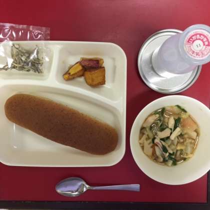 本日の献立は「中華煮・大学いも・ミニフィッシュ・パン・牛乳」でした。