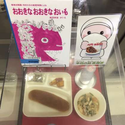 写真中央は、本日の献立サンプルと、給食図書です。本日の給食図書は「おおきな おおきな おいも」でした。子ども達がとても大きいさつまいもを掘り起こし、そのさつまいもを使って、いろいろな楽しい事をする絵本でした。