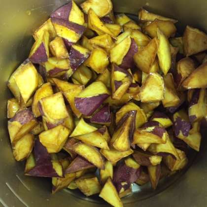大学いもは、乱切りにしたさつまいもを揚げ、手作りのみつをからめた、和食のデザート献立でした。さつまいもは、本日は徳島県産のものが使われました。