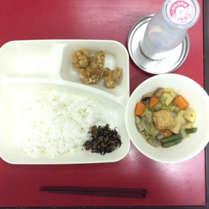 本日の献立は「鶏肉のたつたあげ・あつあげと野菜の煮もの・おかかひじき・ごはん・牛乳」でした。