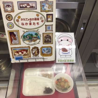 写真中央は、本日の献立サンプルと、給食図書です。本日の給食図書は「かえでがおか農場のなかまたち」でした。