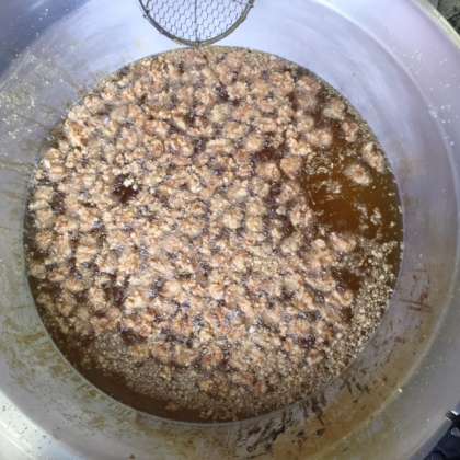 写真右は、鶏肉のたつたあげの鶏肉を揚げている様子です。