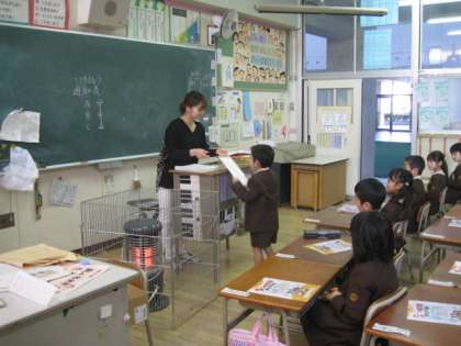 講堂での終業式は大阪市歌斉唱の後、校長先生から「冬休みを安全に楽しく過ごしましょう。年末年始の行事も大切にしましょう。」のお話があり、「十二支のはじまり」等の絵本を読み聞かせしてもらいました。
