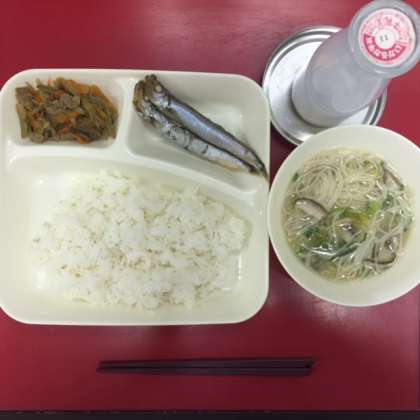 本日の献立は「焼きししゃも・にゅうめん・きんぴらごぼう・ごはん・牛乳」でした。