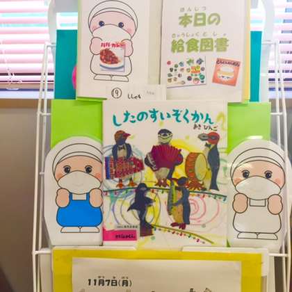 写真中央は、本日の給食図書です。本日の給食図書は「したのすいぞくかん」でした。どちらから読んでも同じ、おつかいかつお、まんざいさんまや、すいかめ、もっきんぎょといった、だじゃれどうぶつがいる水族館の絵本でした。
