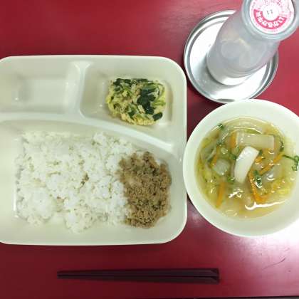 本日の献立は「千草焼き・すまし汁・ツナと三度豆のそぼろ・ごはん・牛乳」でした。