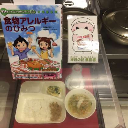写真中央は、本日の献立サンプルと、給食図書です。本日の給食図書は「食物アレルギーの秘密」でした。子どもでも食物アレルギーに対して、分かりやすくまんがで書かれた図書でした。