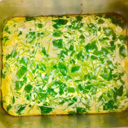 千草焼きは、鶏ひき肉、とうふ、コーンを炒めた具と、鶏卵、だしを合わせ、最後にみつばをちらし、焼き物機で蒸し焼きにした、焼き物献立でした。