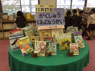 学校図書館では、司書さんがいろいろな行事に合わせて特集コーナーを設けてくださっていますが、11月は「学習発表会」コーナーができています。学芸会や発表会にちなんだ楽しい本が集められていて、子どもたちも手に取って読んでいます。