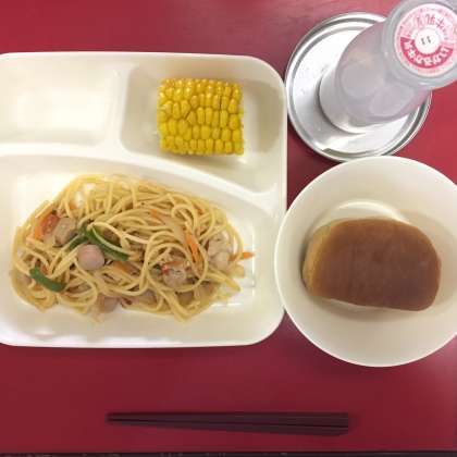 本日の献立は「チキントマトスパゲッティ・蒸しとうもろこし・パン・牛乳」でした。
