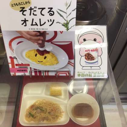 写真中央は、本日の献立サンプルと、給食図書です。本日の給食図書は「とうもろこしからそだてるオムレツ」でした。オムレツのもとは、卵、牛乳、バター、ケチャップです。その卵を産むニワトリや牛乳がとれる牛は、とうもろこしを食べてそだちます。このような料理の原材料の作り方や育て方が詳しく載っている知識絵本の図書でした。