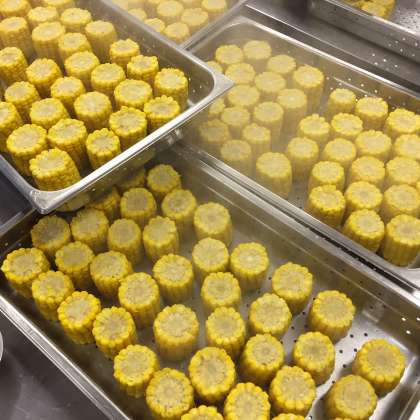 蒸しとうもろこしは、冷凍のとうもろこしを焼き物機で蒸し、30分以上蒸した、蒸し物献立でした。
