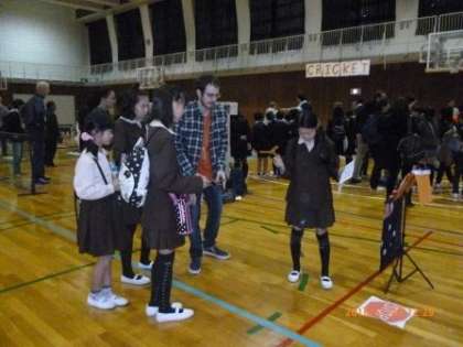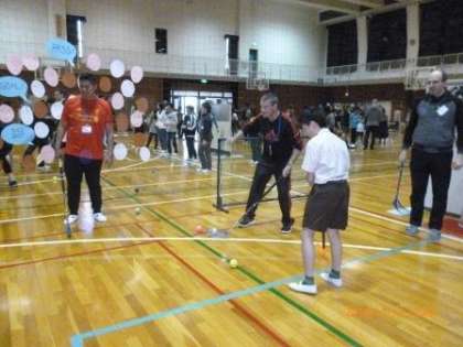 参加児童約260名による開会式が行われた後、子どもたちは用意されたいろいろなコーナーを回って、英語を使いながらホッケー、ブーメラン、ラクロス等のゲームやダンス、キャラクターの絵を描くコーナー等を楽しみました。本校に今来ているBarry先生や、昨年度まで来ていたEddy先生もいていろいろ教えてくださいました。