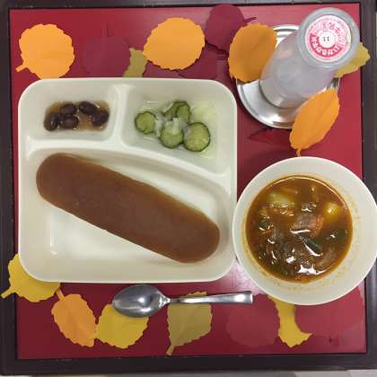 本日の献立は「牛肉と野菜の洋風煮・キャベツときゅうりのサラダ・うずら豆のグラッセ・パン・牛乳」でした。