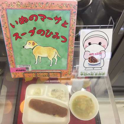 写真中央は、本日の献立サンプルと、給食図書です。本日の給食図書は「いぬのマーサとスープのひみつ」でした。いぬのマーサが、あいうえおマカロニスープを食べて、人間の言葉を話すという絵本でした。