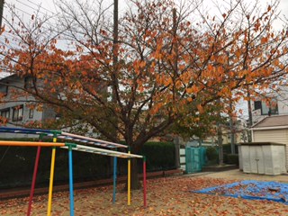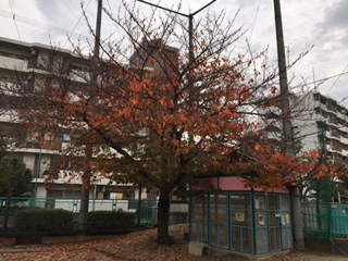 校庭では、サクラやハナミズキなどの木々が赤や黄色に色づいています。落ち葉が多くて掃除が大変ですが、木々の下で子どもたちは元気に走り回っています。