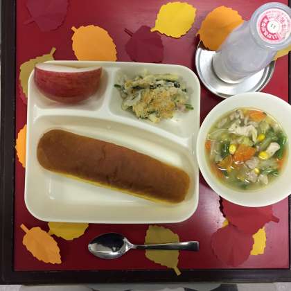 本日の献立は「鶏肉と野菜のスープ煮・ほうれん草のグラタン・りんご・パン・牛乳」でした。