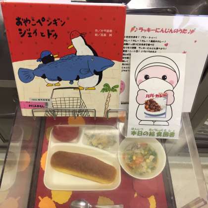 写真中央は、本日の献立サンプルと、給食図書です。本日の給食図書は「おやこペンギン ジェイとドゥ」でした。ふだん料理を作らないペンギンのお父さんと子どもが、お母さんのために、グラタンやケーキを作る絵本でした。