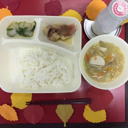 本日の献立は「赤魚のしょうゆだれかけ・みそ汁・おおさかしろなのごまあえ・ごはん・牛乳」でした。