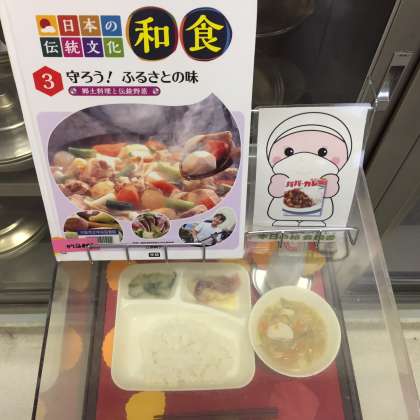 写真中央は、本日の献立サンプルと、給食図書です。本日の給食図書は「日本の伝統文化 和食」でした。全国各地の郷土料理が写真で載っている、知識の図書でした。