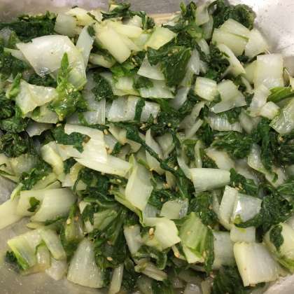 写真右は、出来上がった、おおさかしろなのごまあえです。
