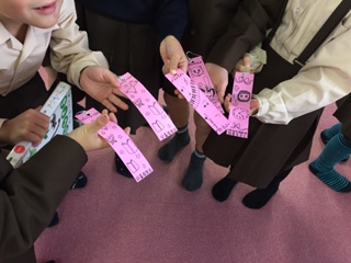 1番上の写真は図書委員会が、お昼の図書館開放に来た人に、手作りのしおりをプレゼントしているところです。図書委員のデザインで毎日色違いのしおりが配られています。もらった子どもたちは大喜び。本を読むときに役立ててほしいですね。