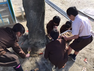 3番目の写真は、昨日の委員会活動の様子です。環境委員会が、校内の樹木の根元に肥料をあげて回りました。各委員会が学校生活を支える大切な役割を果たしています。