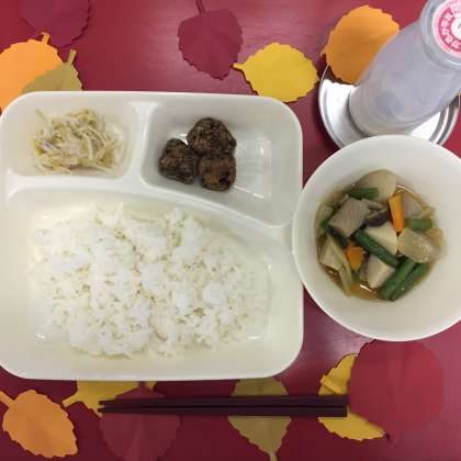 本日の献立は「くじらのたつたあげ・さといもと野菜の煮もの・もやしのゆずの香あえ・ごはん・牛乳」でした。