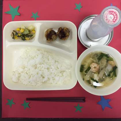 本日の献立は「あげシューマイ・えびととうふのスープ・ツナとチンゲンサイのいためもの・ごはん・牛乳」でした。