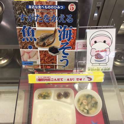 写真中央は、本日の献立サンプルと、給食図書です。本日の給食図書は「すがたをかえる 魚 海そう」でした。かつおぶしやかまぼこ、ツナ等、魚や海そうが加工食品になる様子が載っている図書でした。