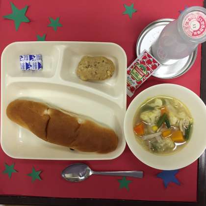 明日の献立は「豚肉と干しずいきのみそ煮・五目汁・焼きかぼちゃ・ごはん・牛乳」です。明日で2学期最後の給食になります。明日も楽しみにしていてくださいね。
