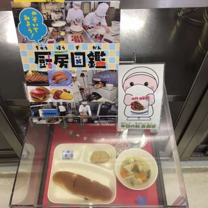 写真中央は、本日の献立サンプルと、給食図書です。本日の給食図書は「のぞいてみよう!厨房図鑑」でした。有名なラーメン屋さんやフォミリーレストラン等、いろいろな厨房が写真で説明されている図書でした。