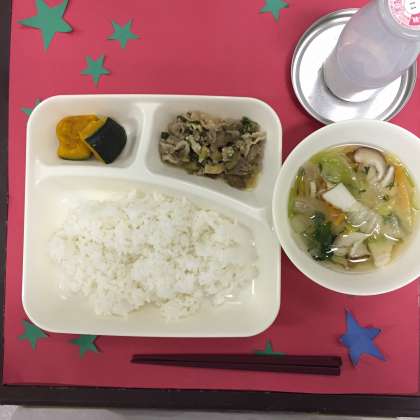 本日の献立は「豚肉と干しずいきのみそ煮・五目汁・焼きかぼちゃ・ごはん・牛乳」でした。